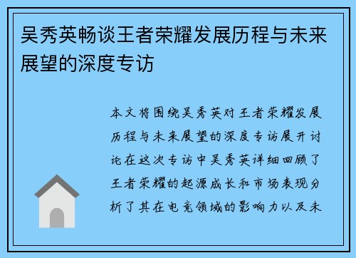 本文将通过对话吴丽,深入探讨她在英雄联盟职业生涯中所经历的挑战与成就。吴丽作为一位杰出的职业玩家,不仅在比赛中展现了卓越的技术和战术素养,还在职业生涯的不同阶段面临了巨大的压力与困难。文章将从四个方面进行详细阐述:首先是她职业生涯的起步与发展,其次是竞技场上的挑战,再者是个人成长与团队合作,最后则是她对未来的展望与思考。通过这些方面,我们可以更全面地理解吴丽在电竞领域中的奋斗历程,以及她所取得的辉...